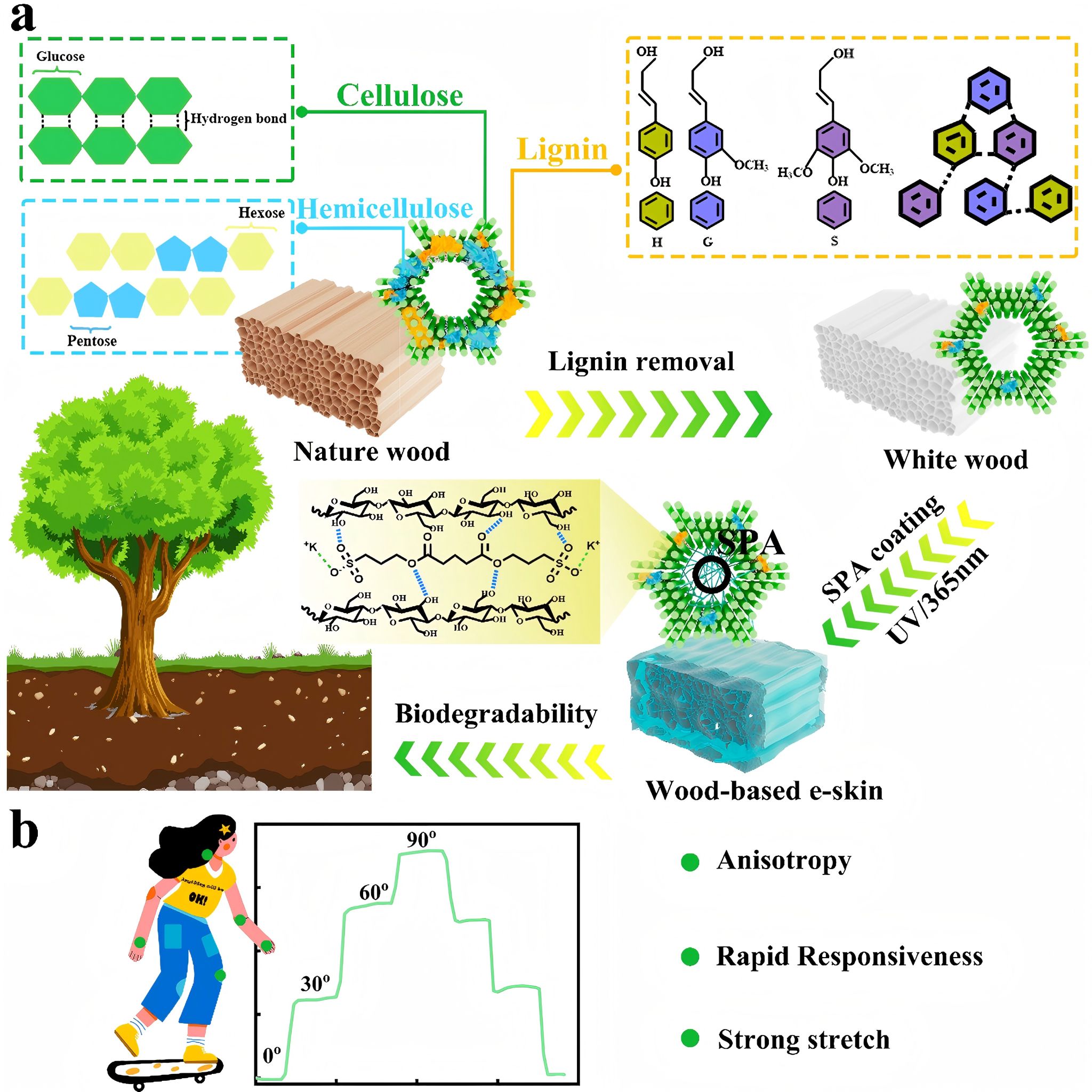 本研究通过细胞壁纳米工程,对木材细胞壁进行选择性水解,脱除半纤维素及木质素,从而构建出具有定向结构的木基纤维素骨架,在此过程中,细胞壁被软化,同时在木材通道内形成一个相互连接的纤维素网络。随后,利用木基纤维素中的羟基(-OH)及羧基(-COOH)等亲水性基团与3-磺丙基丙烯酸盐-钾盐(SPA)中的钾离子(K⁺)和磺酸根离子(SO₃2⁻)形成氢键及离子键键合,制备得到具有多尺度复合交联网络结构的木基电子皮肤。(图1)。