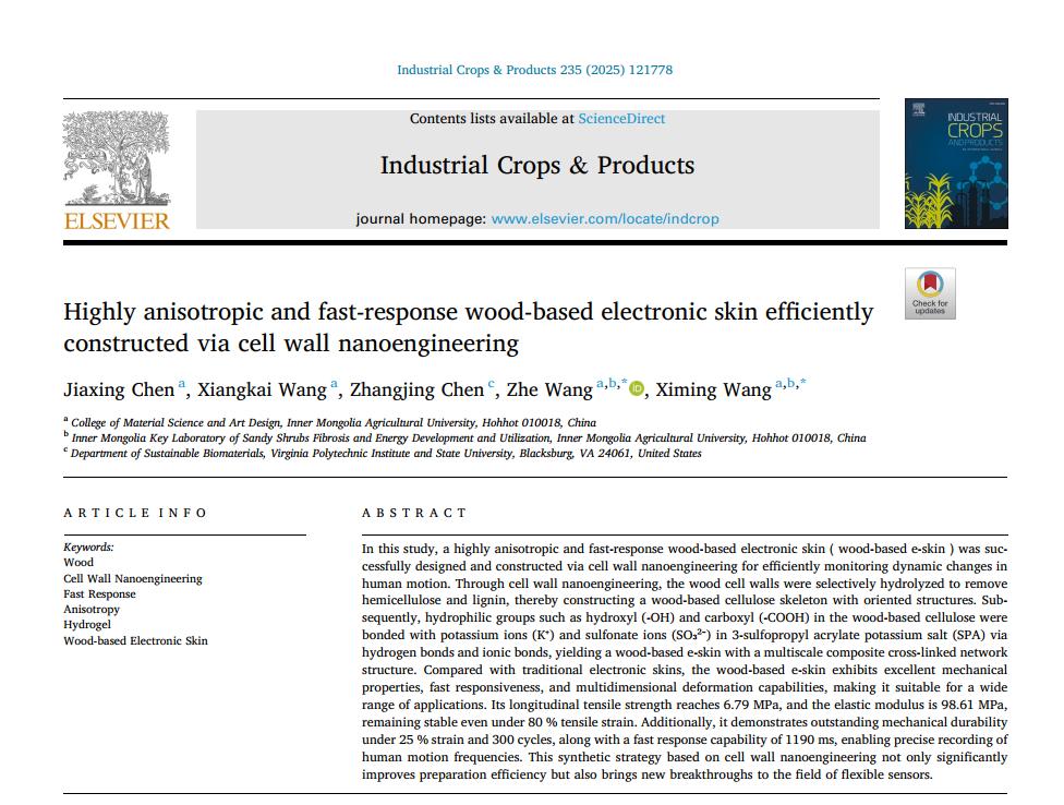近日,以内蒙古农业大学为第一完成单位,内蒙古农业大学王哲副教授、王喜明教授为通讯作者,材料科学与艺术设计学院博士生陈佳星为第一作者完成的研究成果“基于细胞壁纳米工程高效构筑高各向异性且快速响应的木基电子皮肤”( Highly anisotropic and fast-response wood-based electronic skin efficiently constructed via cell wall nanoengineering)发表在农林领域一区Top期刊《Industrial Crops & Products》上,该研究得到国家自然科学基金(32101455)、内蒙古自治区教育厅一流学科科研专项(YLXKZX-NND-011、YLXKZX-NND-059)以及内蒙古农业大学基本科研业务费专项(BR22-12-01)的资助和支持。