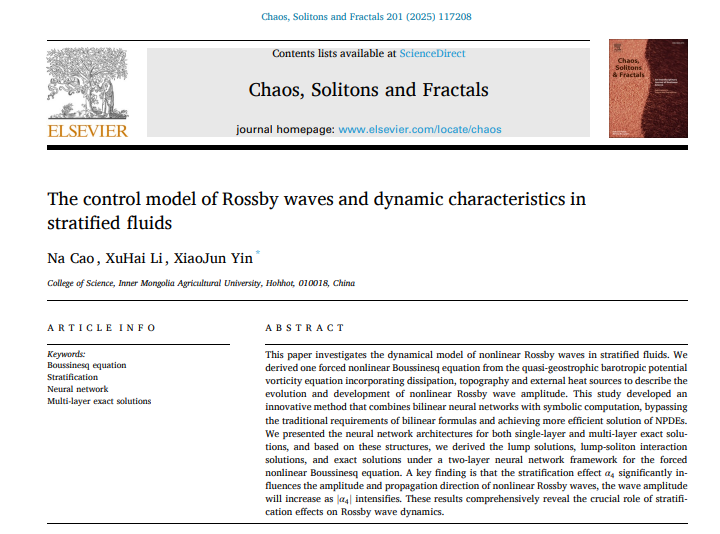 近日,我校理学院尹晓军副教授课题组在国际知名数学物理期刊《Chaos, Solitons & Fractals》(中科院SCI一区TOP期刊)发表论文《The control model of Rossby waves and dynamic characteristics in stratified fluids》。论文第一作者为理学院曹娜副教授,通讯作者为理学院尹晓军副教授,其他合作者均为课题组成员。