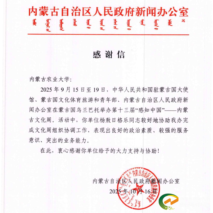 期间,我校国际教育学院杨敖日格乐老师在文化周活动中圆满完成相关工作任务。活动结束后,我校收到自治区政府新闻办感谢信,信中高度肯定了杨敖日格勒的组织协调工作,称其充分展现出农大教职工专业务实、担当有为的良好形象,并对学校在促进中蒙文化交流中作出贡献致以诚挚谢意。