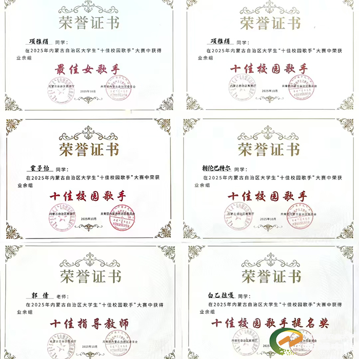 近日,2025年内蒙古自治区大学生“十佳校园歌手”暨东北三省一区声乐专业大学生“十佳校园歌手”大赛在内蒙古师范大学盛乐校区圆满落幕。我校选派学生在业余组比赛中表现优异,荣获多项荣誉。