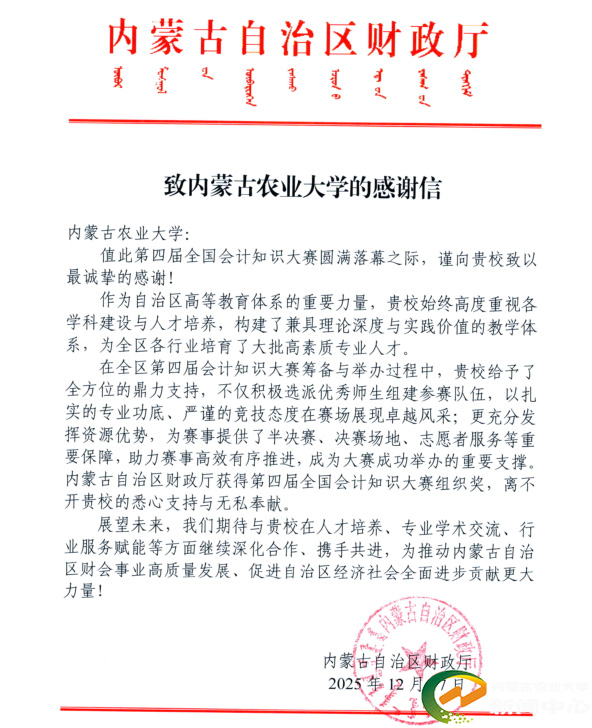 近日,第四届全国会计知识大赛圆满落幕,我校收到自治区财政厅发来的感谢信。信中对我校在大赛筹办过程中给予的支持与贡献表示感谢,并对我校的办学实力与师生精神风貌给予了高度评价。