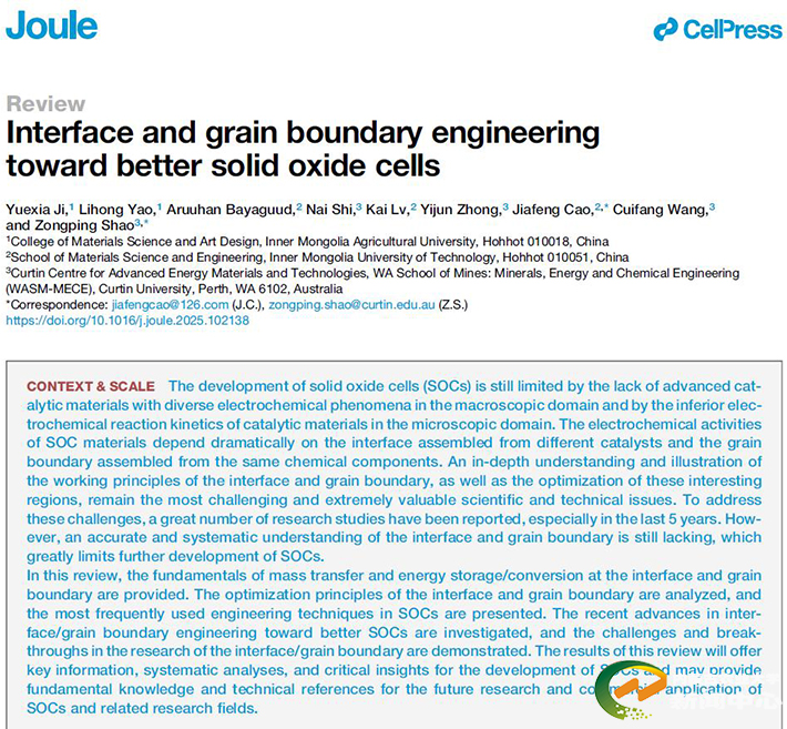近日,我校为第一完成单位,材料科学与艺术设计学院冀月霞副教授为第一作者在Cell子刊Joule(中科院1区Top)上发表题为“Interface and grain boundary engineering toward better solid oxide cells”论文,内蒙古工业大学与澳大利亚Curtin University为合作单位。该成果得到内蒙古农业大学高层次人才科研启动项目等支持。