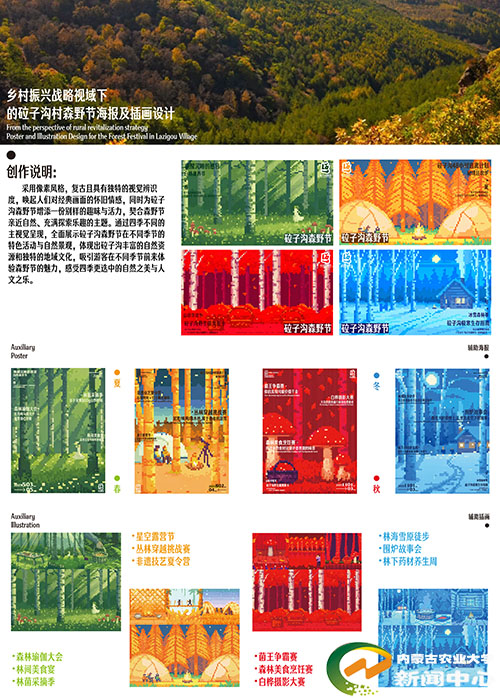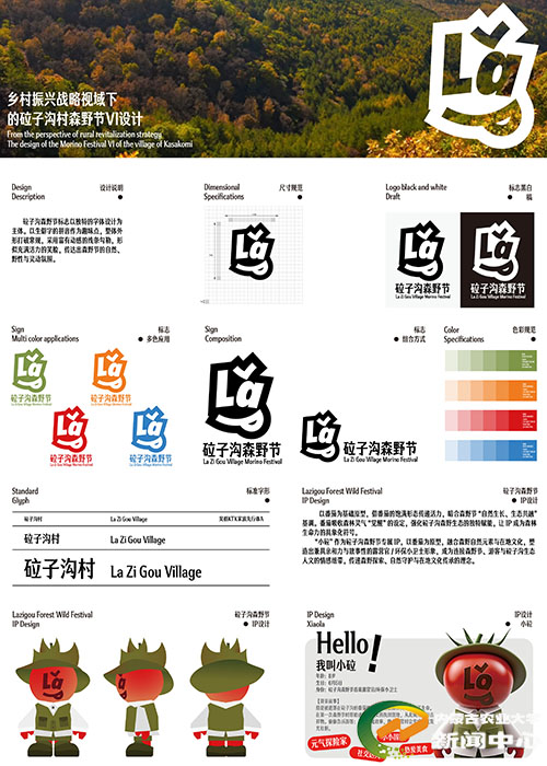 本次活动由自治区市场监管局等五部门联合主办,是区内具有广泛影响力的创意赛事,吸引了全区高校师生及相关行业从业者积极参与。本次获奖作品紧扣乡村振兴主题,基于赤峰市喀喇沁旗王爷府镇砬子沟村的实际需求进行创作。设计团队深入当地,挖掘村落森林资源与民俗文化特色,运用现代设计语言,打造了系统性的视觉识别(VI)体系。该作品致力于突破乡村文旅形象同质化困境,以市场为导向,助力激活乡村文旅产业,实现了艺术美感、文化传承与经济效益的有机统一。